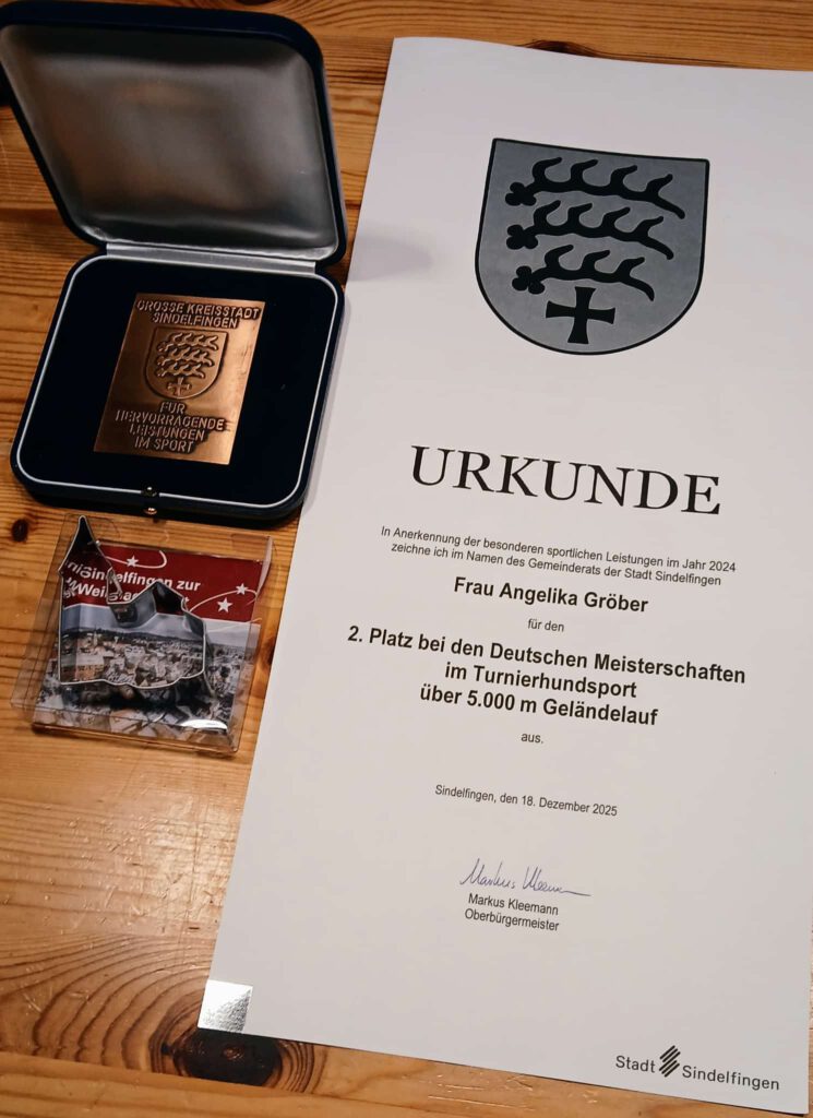 Die Stadt Sindelfingen hat am 18.12.2025 Sportler der Sindelfinger Vereine für herausragende Leistungen geehrt. Angelika Gröber war eingeladen und bekam Urkunde und Präsent von Oberbürgermeister Markus Kleemann und Kulturamtsleiter Markus Nau überreicht (Foto).